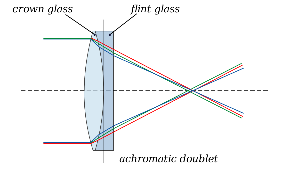 Geralmente, quando estudamos lentes, nós começamos por lentes singulares, onde a dispersão que pode ser encontrada utilizando algumas fórmulas como a de Abbe, é inevitável, porém, se usarmos pares de lentes a coisa muda. Não vamos esquecer que Newton foi esperto ao criar o seu telescópio utilizando-se da lei de snell e espelhos reflexivos, e refletir uma luz branca, não depende da lei de refração, fazendo com que espelhos não demonstrem aberrações cromáticas na maioria dos casos. A ideia para evitar esse problema foi olhar para a fórmula de dispersão para lentes singulares, que relaciona as cores azul, vermelho e amarelo, onde azul e vermelho são os extremos do espectro, e o amarelo geralmente serve para calcular uma distância ou a elevação do número de Abbe. No caso, queriam descobrir como fazer com que os valores de dispersão para azul e vermelho fossem iguais, para que assim se anulassem? Bom, surgiram aí os pares de lentes que geralmente chama de "flint and crown", um desenho bem comum de se ver em aulas de óptica, e isso foi incrível pois diminui a aberração cromática em uma escala surpreendente.