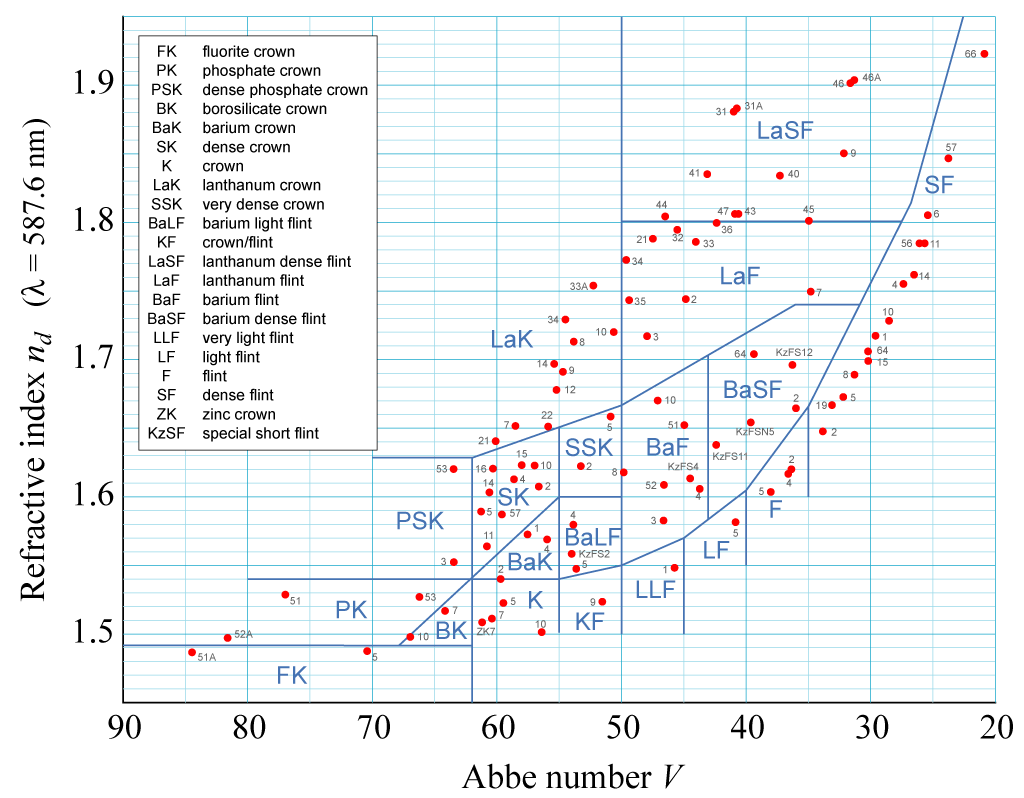 Como escolher um "vidro" correto então para minimizar esses efeitos que podem vir a atrapalhar nas aplicações de lentes, como por exemplo em câmeras, ou sistemas de fibra óptica? Escolhendo lentes com o máximo de diferença de disperssão possível, para pode cancelar a aberração, pois a fórmula de dispersão para um par está relacionada com a diferença entre o número de Abbe da lente 1 e da lente 2. Geralmente os engenheiros por trás de um projeto olham para o "mapa de vidro" (Glass Map), que relaciona o índice de refração (para vidros em média fica ali no 1.48, sendo que água é aproximadante 1.40), e o número de Abbe. Além disso você pode analisar coisas como preço do vidro, toxicidade, facilidade de ser manipulado e modificado, entre outros. Essa tabela foi feita em relação a medição do índice de refração do ar, que aprendemos na escola ser de valor 1, o que é mentira, pois seu valor varia em casas decimais com a temperatura e pressão, e sim, casas decimais para um engenheiro pode ser um pesadelo no projeto.